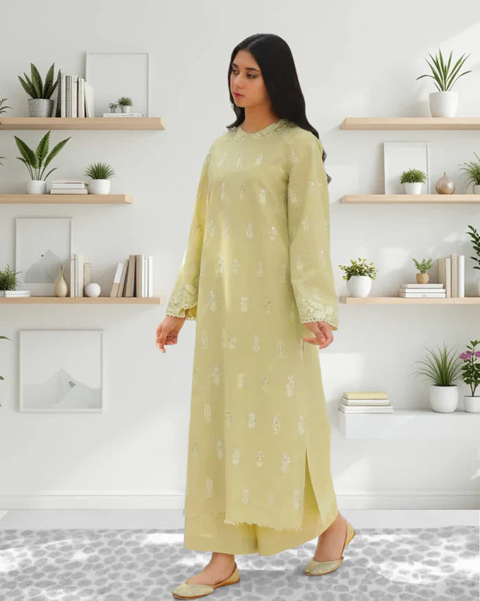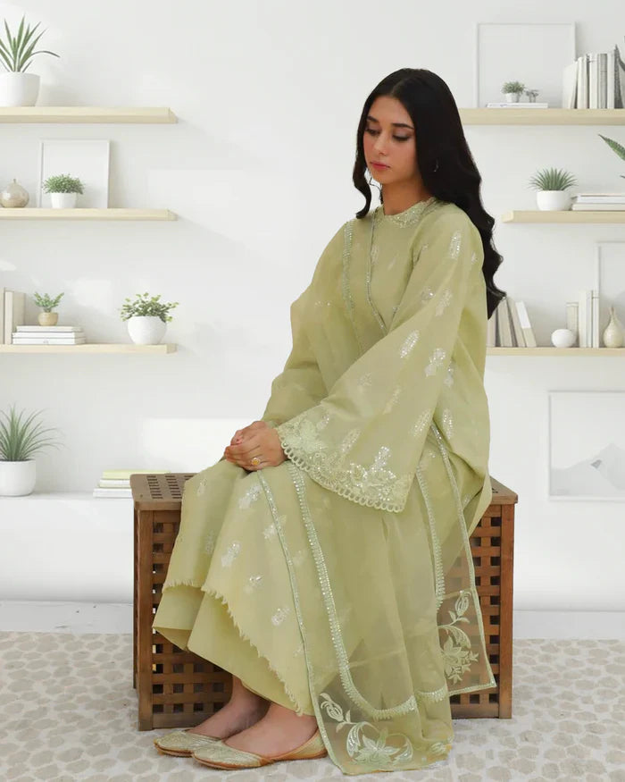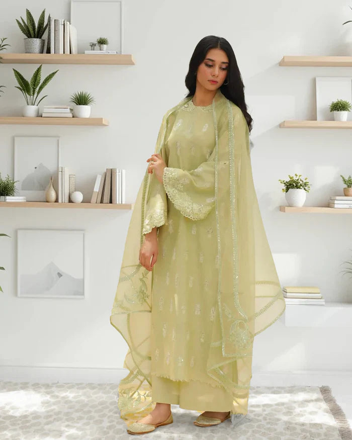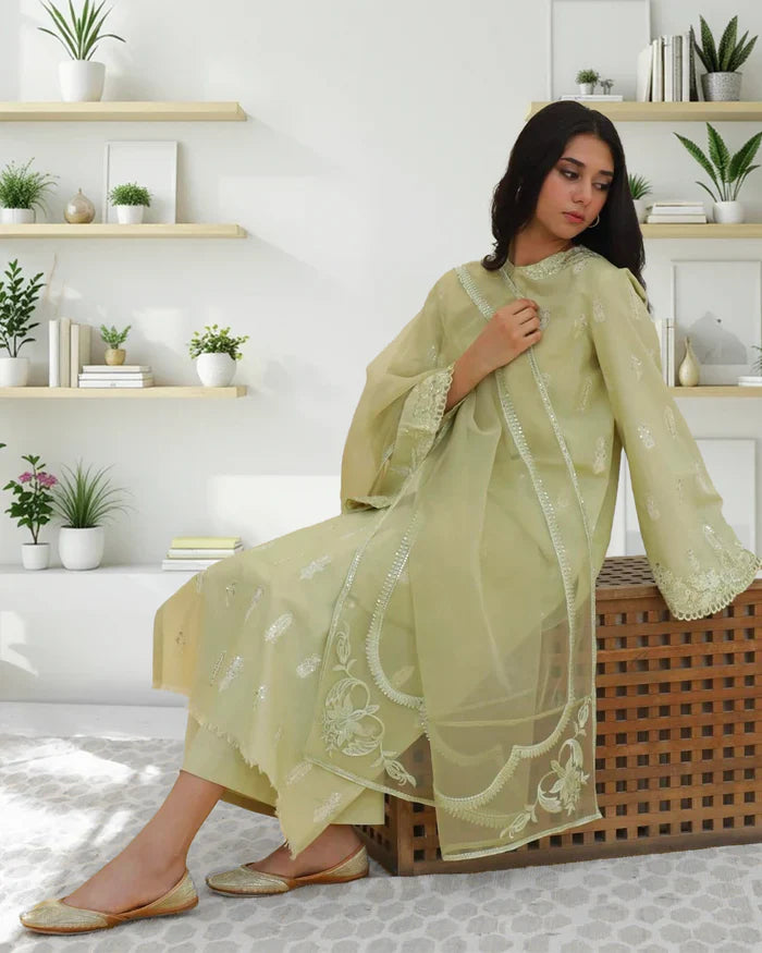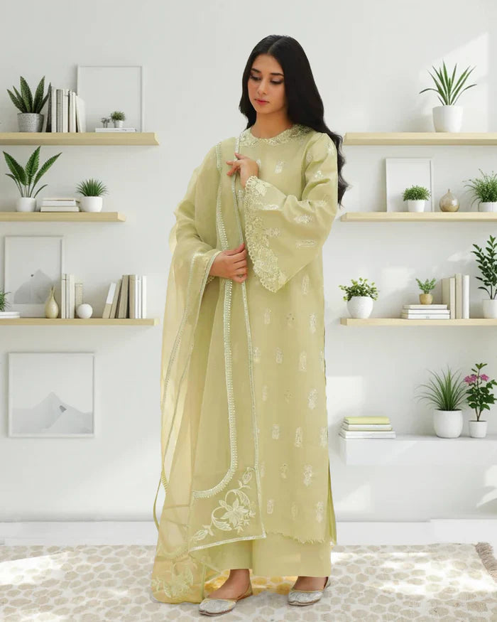 Grace meets sophistication in Lime Green, a luxurious 3-piece premium lawn suit adorned with delicate embroidery and paired with an artfully embellished organza dupatta. The soft lime hue adds a touch of modern elegance, perfect for both festive occasions and chic everyday wear.