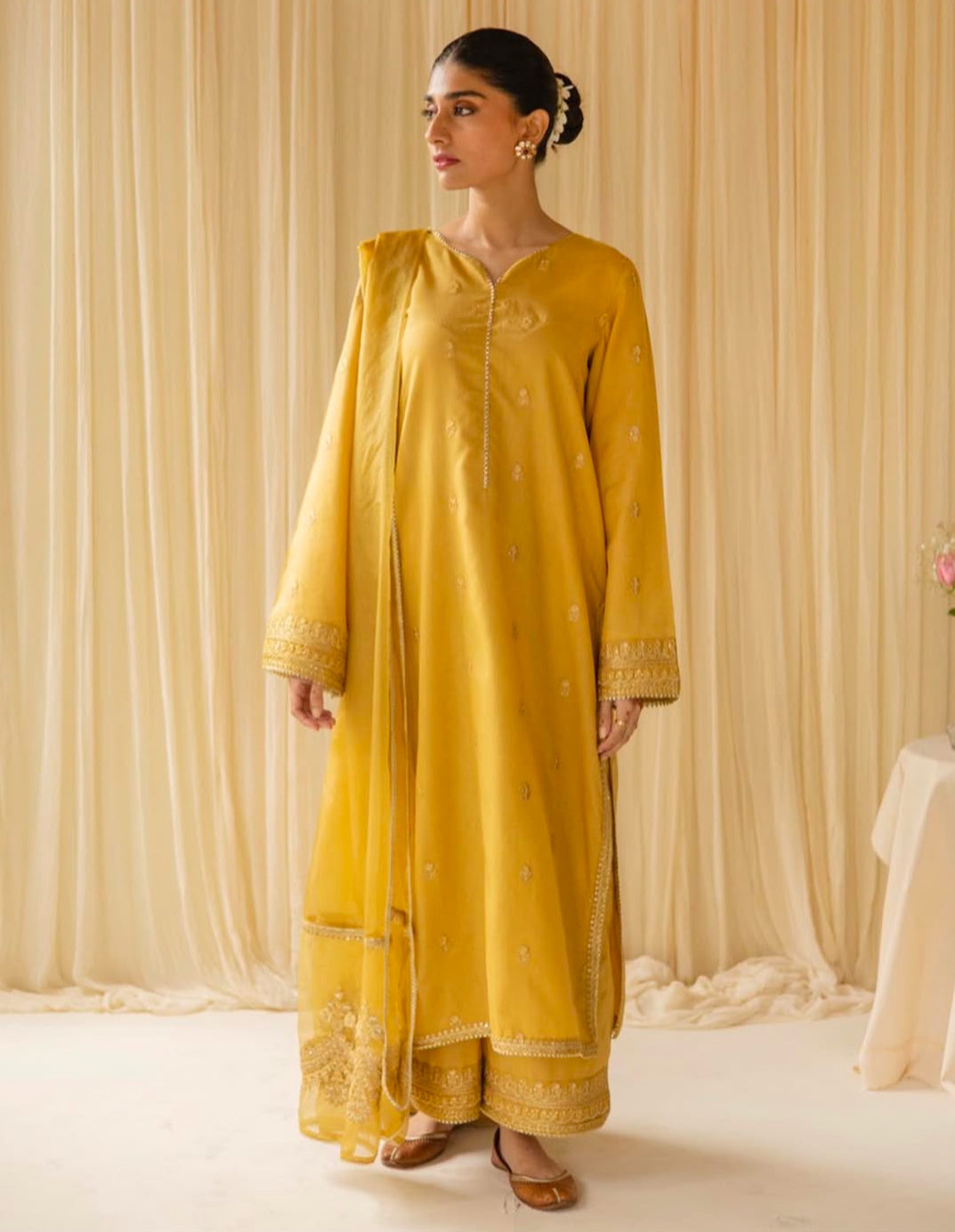 Illuminate your look with Zard Zareen, a radiant 3-piece mustard ensemble that blends traditional charm with refined elegance. Crafted from premium lawn, the shirt and dupatta are adorned with intricate golden tilla embroidery, adding a luxurious, festive touch.