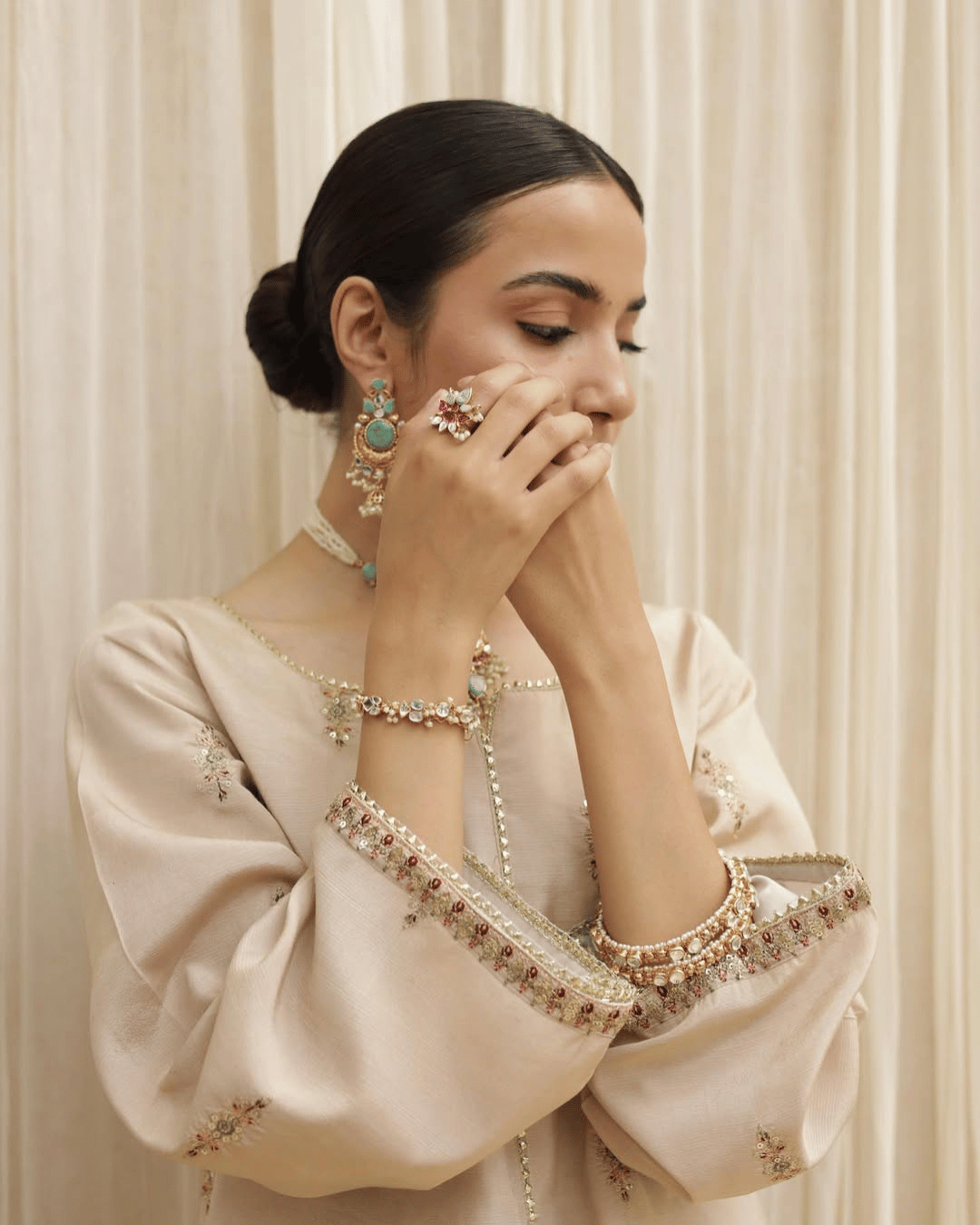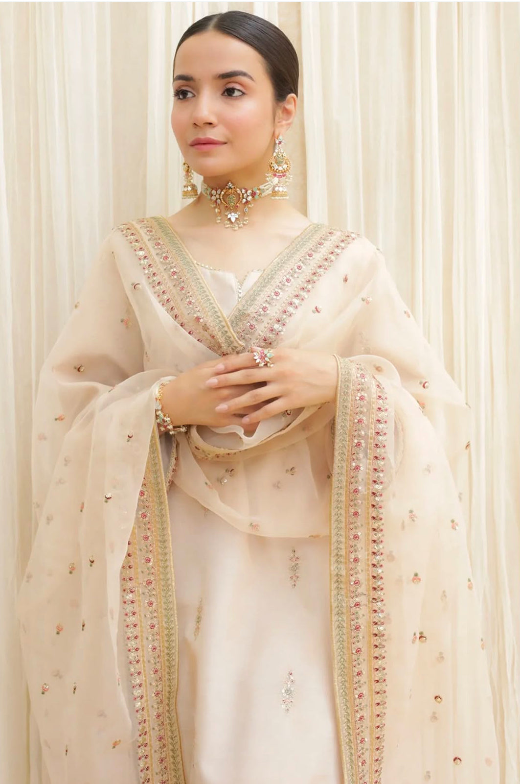 Soft tones and refined detailing make this ensemble perfect for festive and formal occasions.
