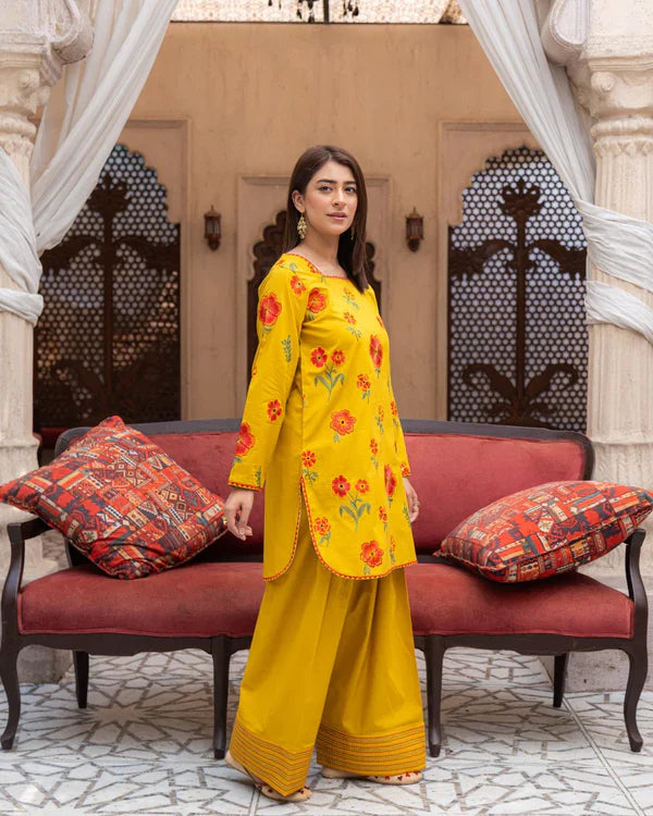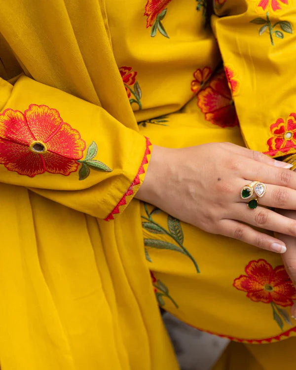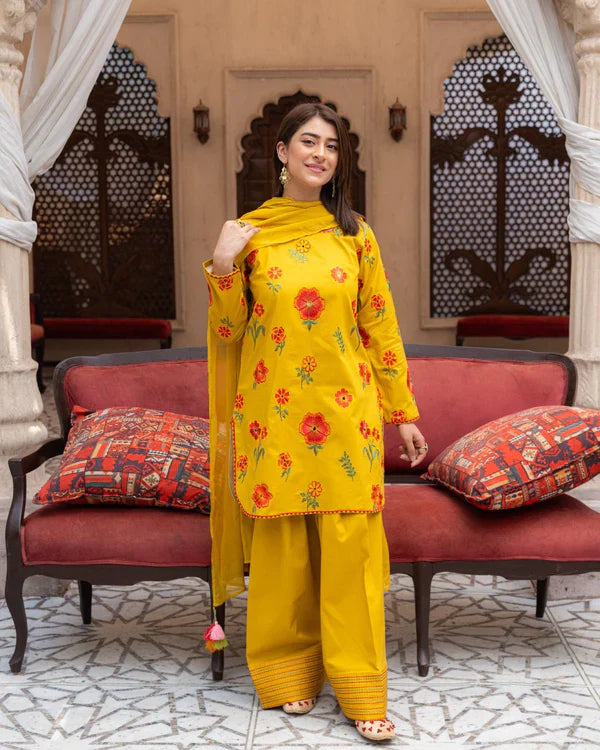 Mustard Bloom is a vibrant 3-piece stitched ensemble in rich mustard yellow, featuring delicate red and green floral embroidery that evokes the freshness of spring. The straight-cut kurta is paired with a classic Farshi shalwar adorned with subtle threadwork, while a light chiffon dupatta with playful tassels completes the look. Perfect for festive brunches, daytime gatherings, and summer celebrations, this outfit blends traditional charm with effortless elegance.