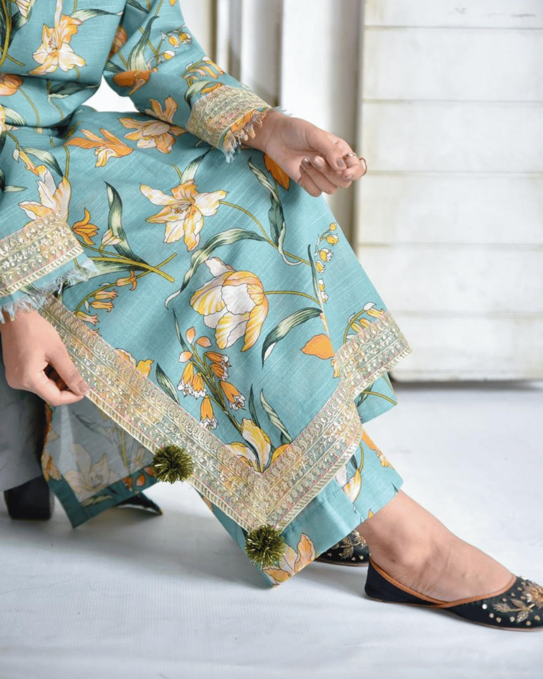 The shirt is beautifully adorned with embroidered patches on the daman, chalk, and sleeves, while the matching printed trousers complete the contemporary look — perfect for festive events, casual outings, or daytime gatherings.